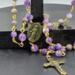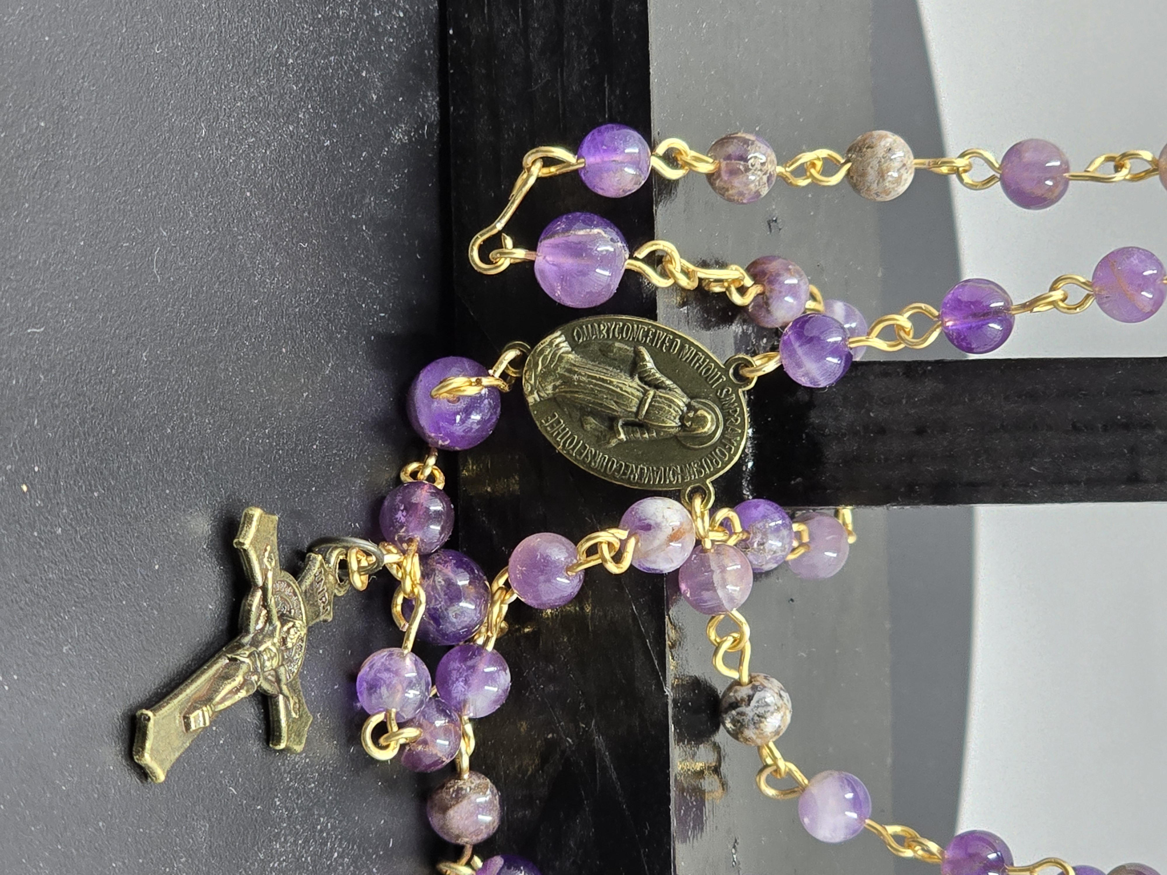 This Rosary is made from chevron amethyst. Chevron amethyst differs from other amethyst due to the band of quartz that runs through it. Natural gemstones are said to have many metaphysical properties. Amethyst is said to help in stress relief while chevron amethyst is said to have a strengthening property. Put them together and you have a Rosary that will strengthen and relieve the stress with your prayers. Well maybe.