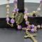 This Rosary is made from natural chevron amethyst. Each link is made from silver coated, tarnish resistant gold colored wire.
