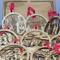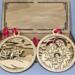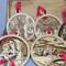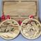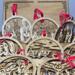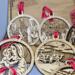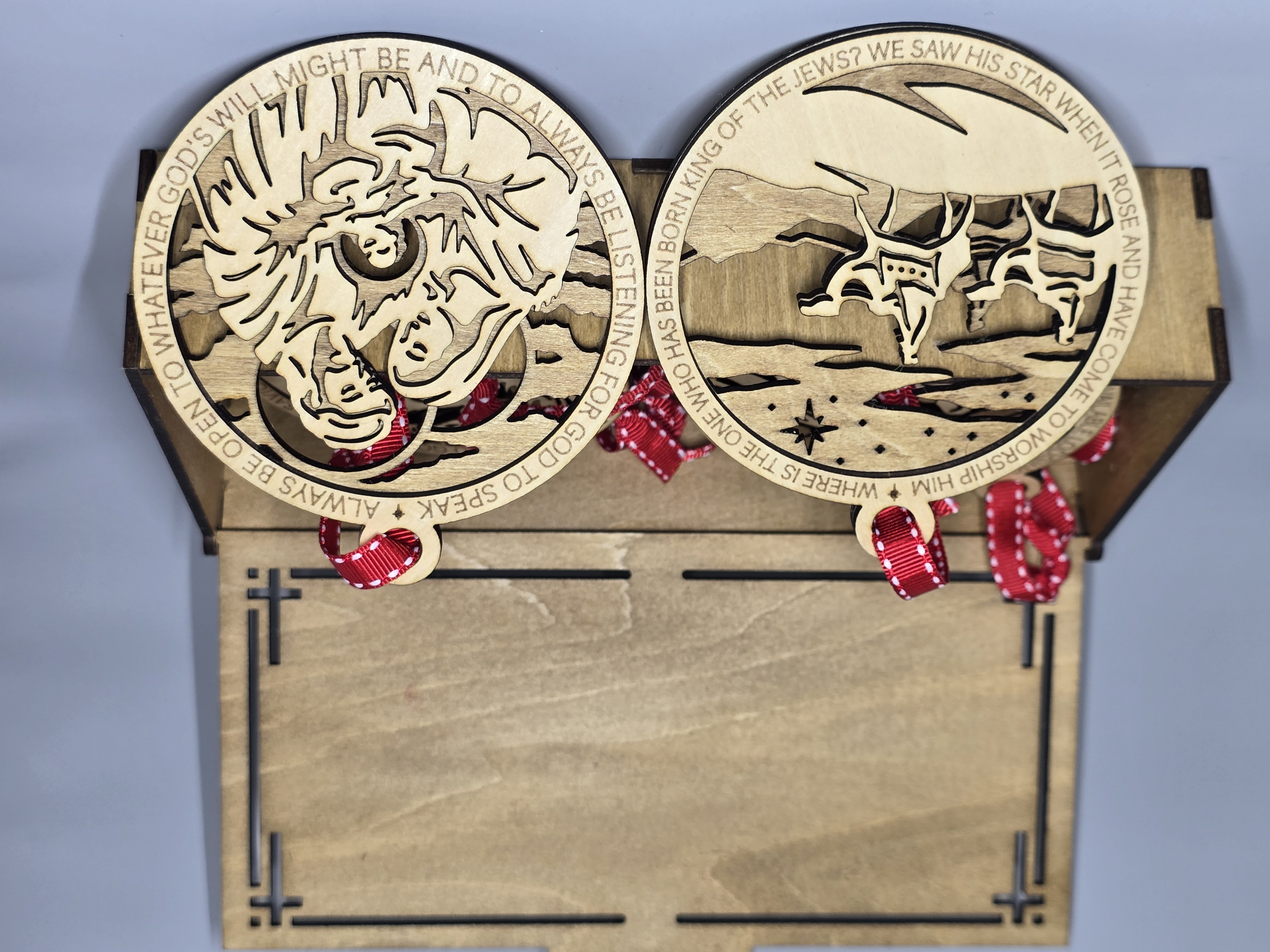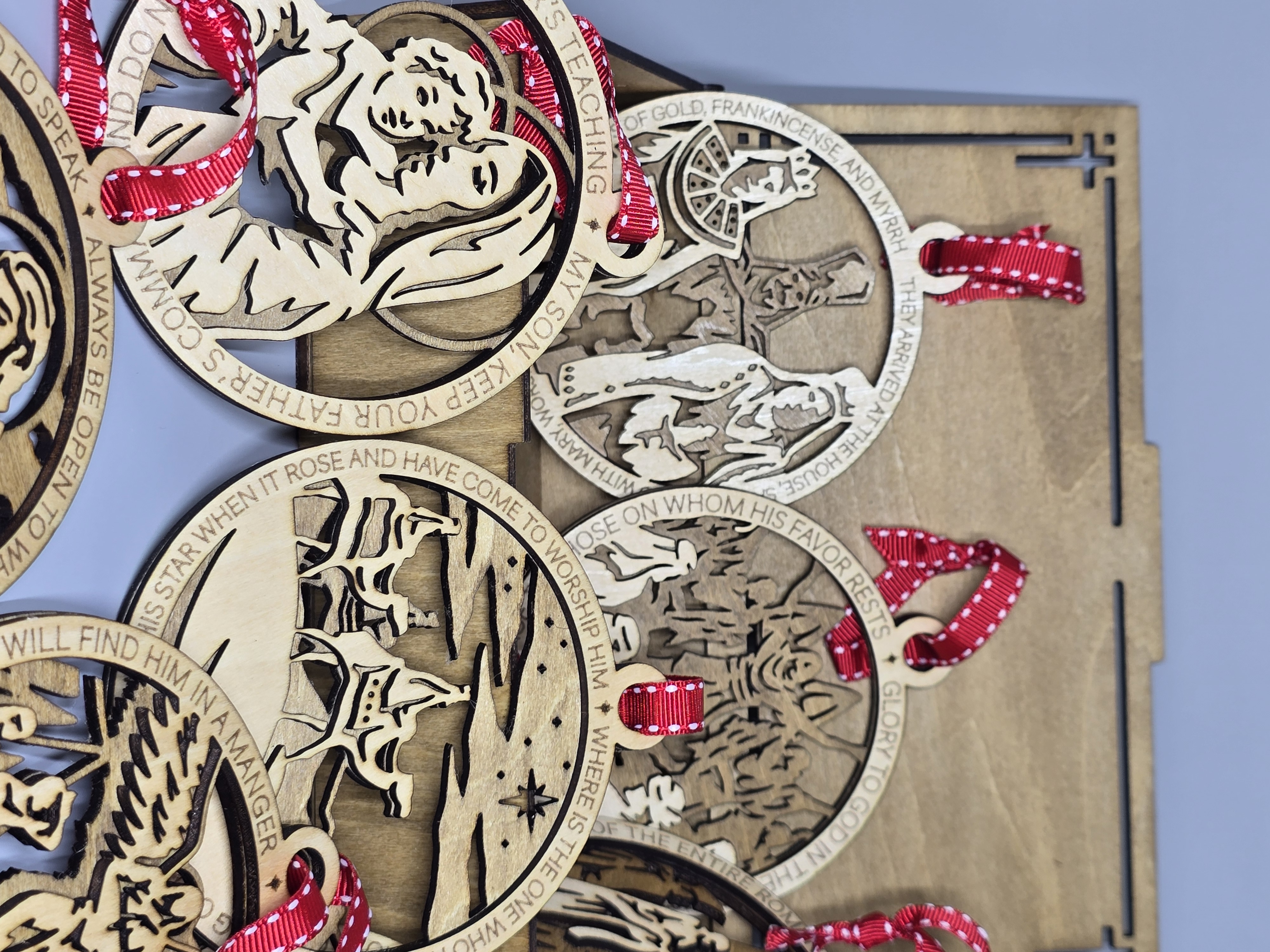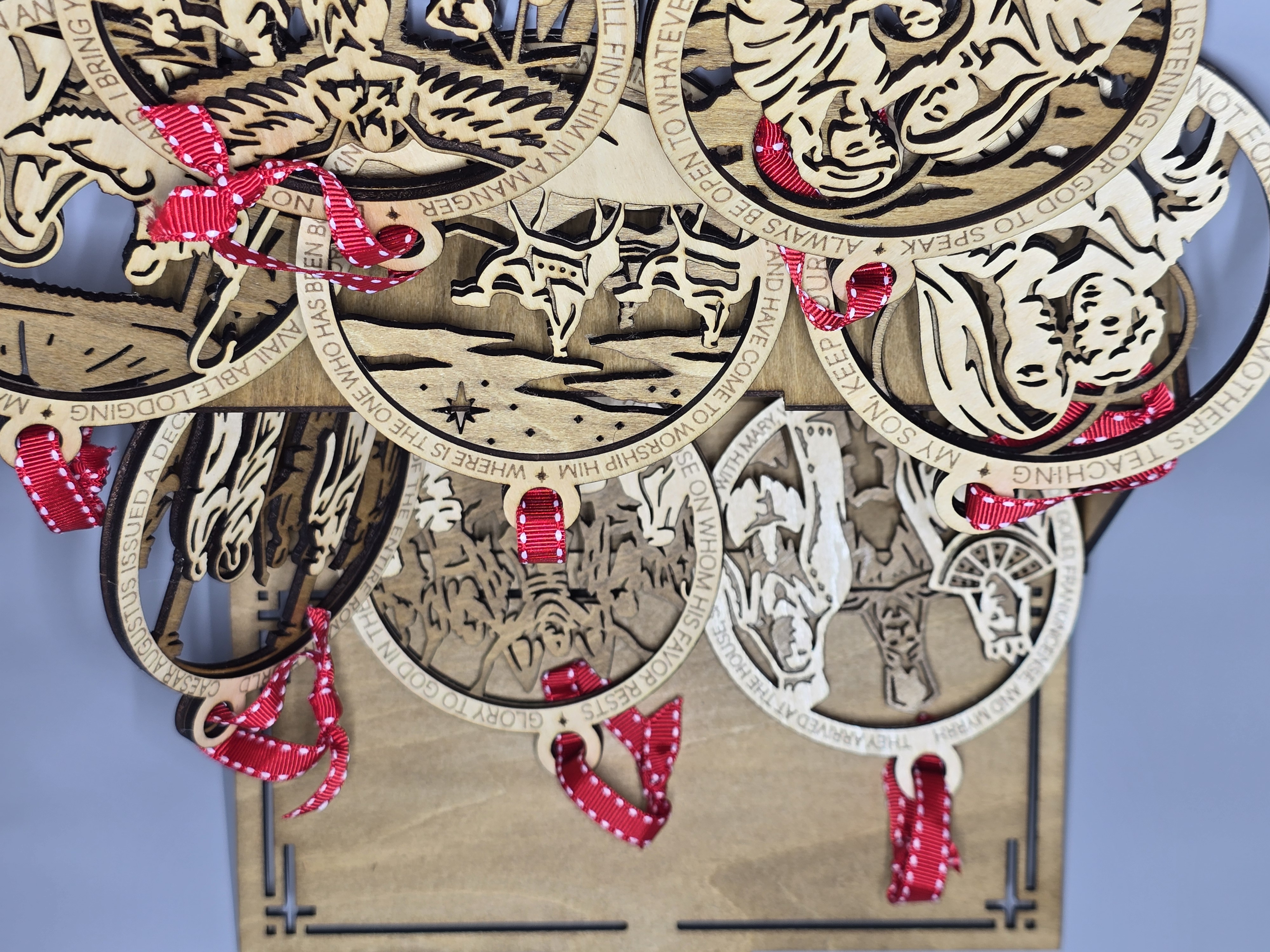 Each ornament is four-inches in diameter and depicts a different scene from the Christmas story. Each one also has a religious saying circling the outer edge, and the back layer of each 3-D ornament is stained to add depth to each piece. Each has a decorative ribbon tied through the top holder for hanging.