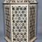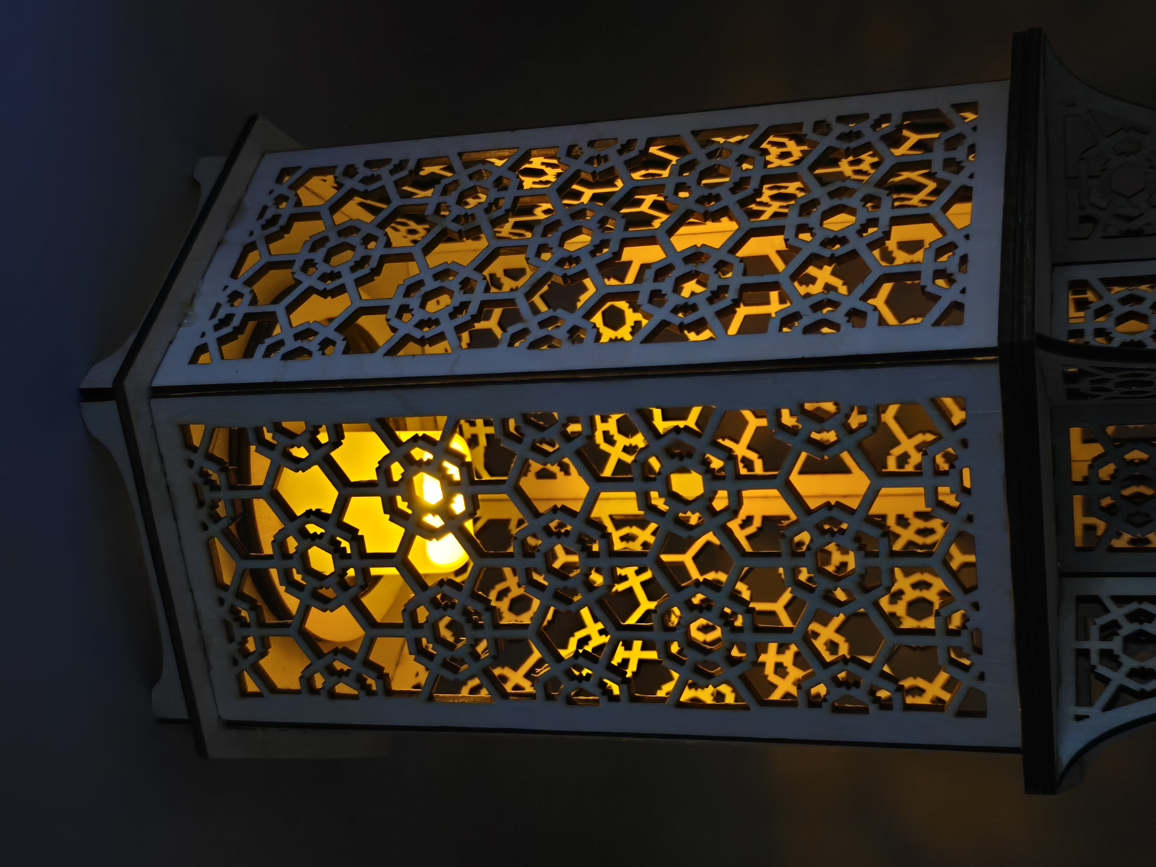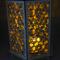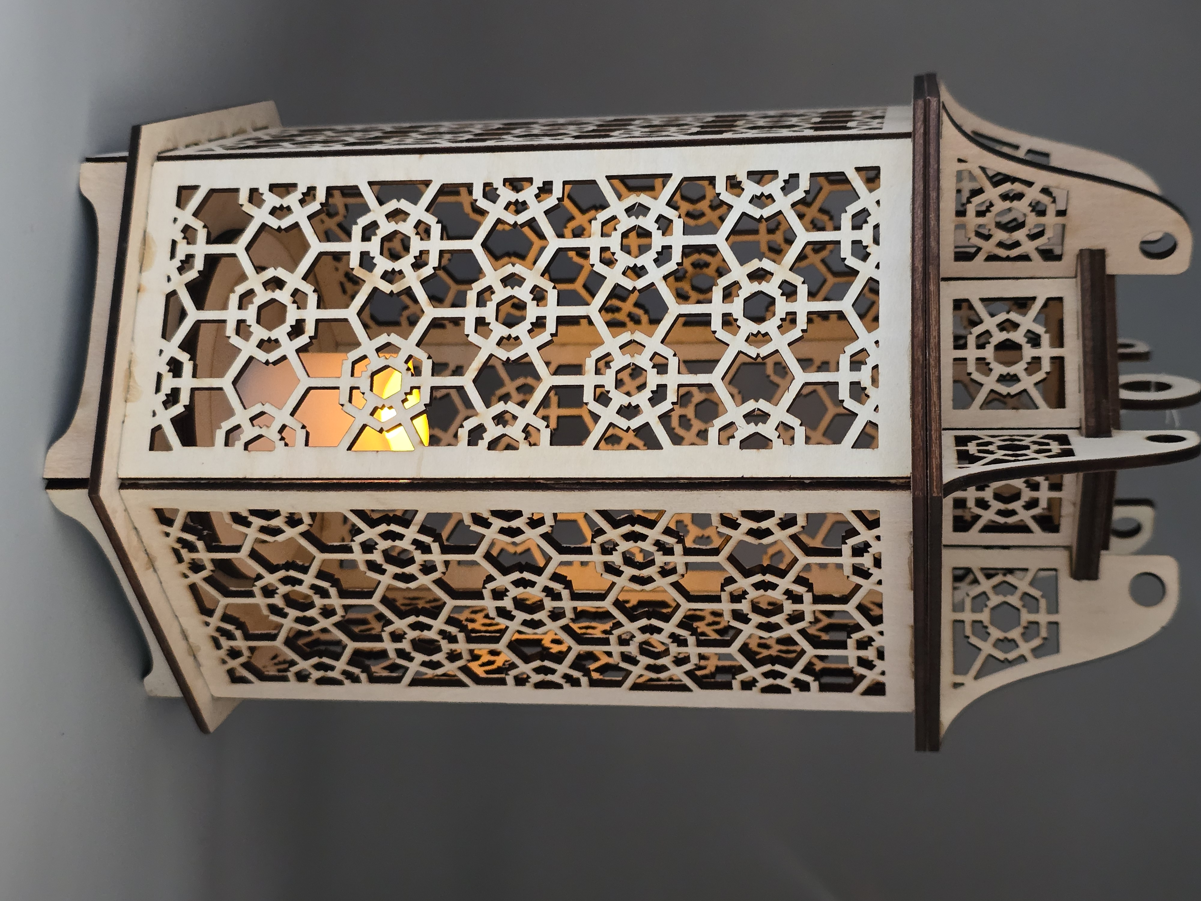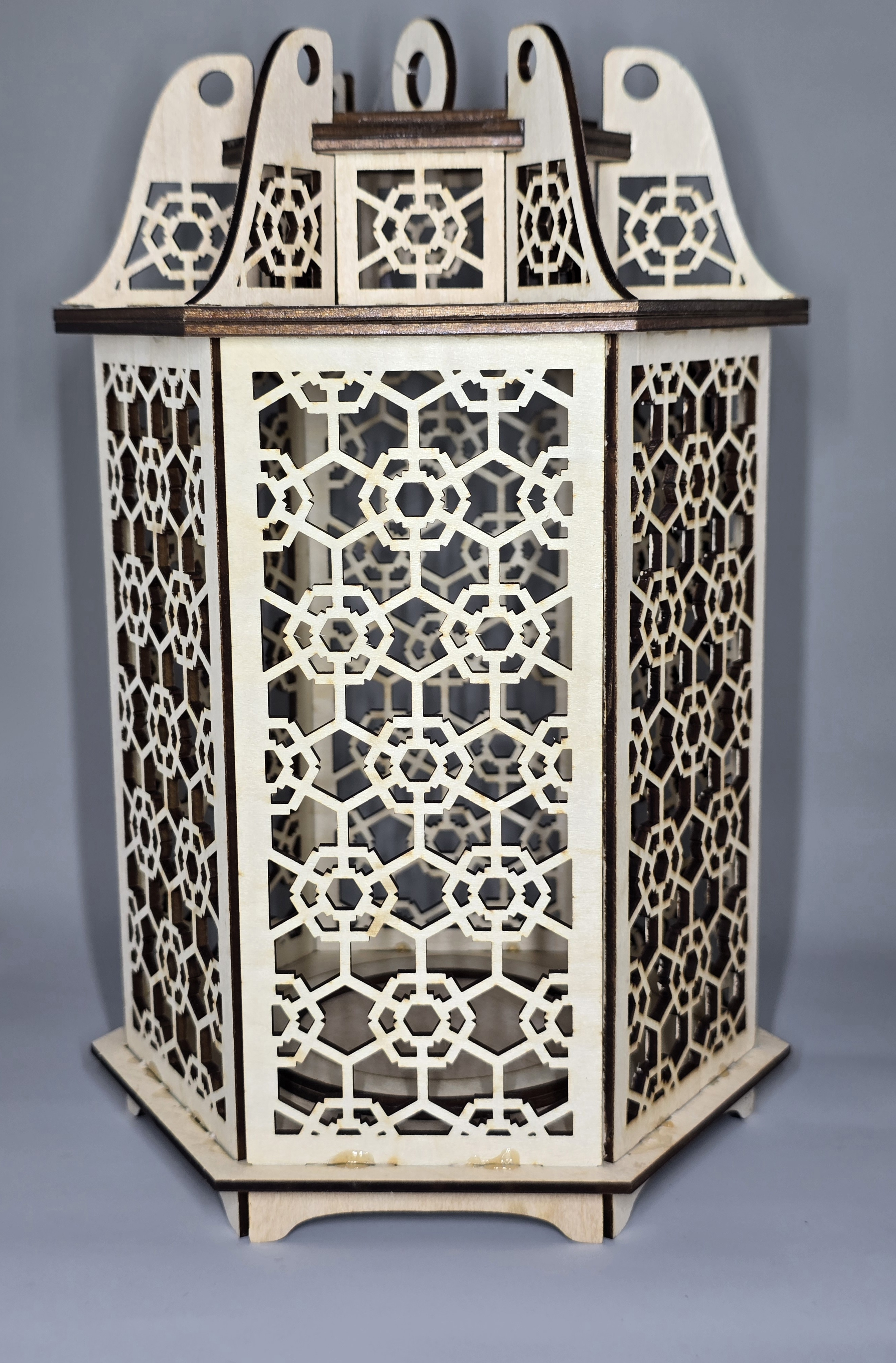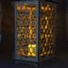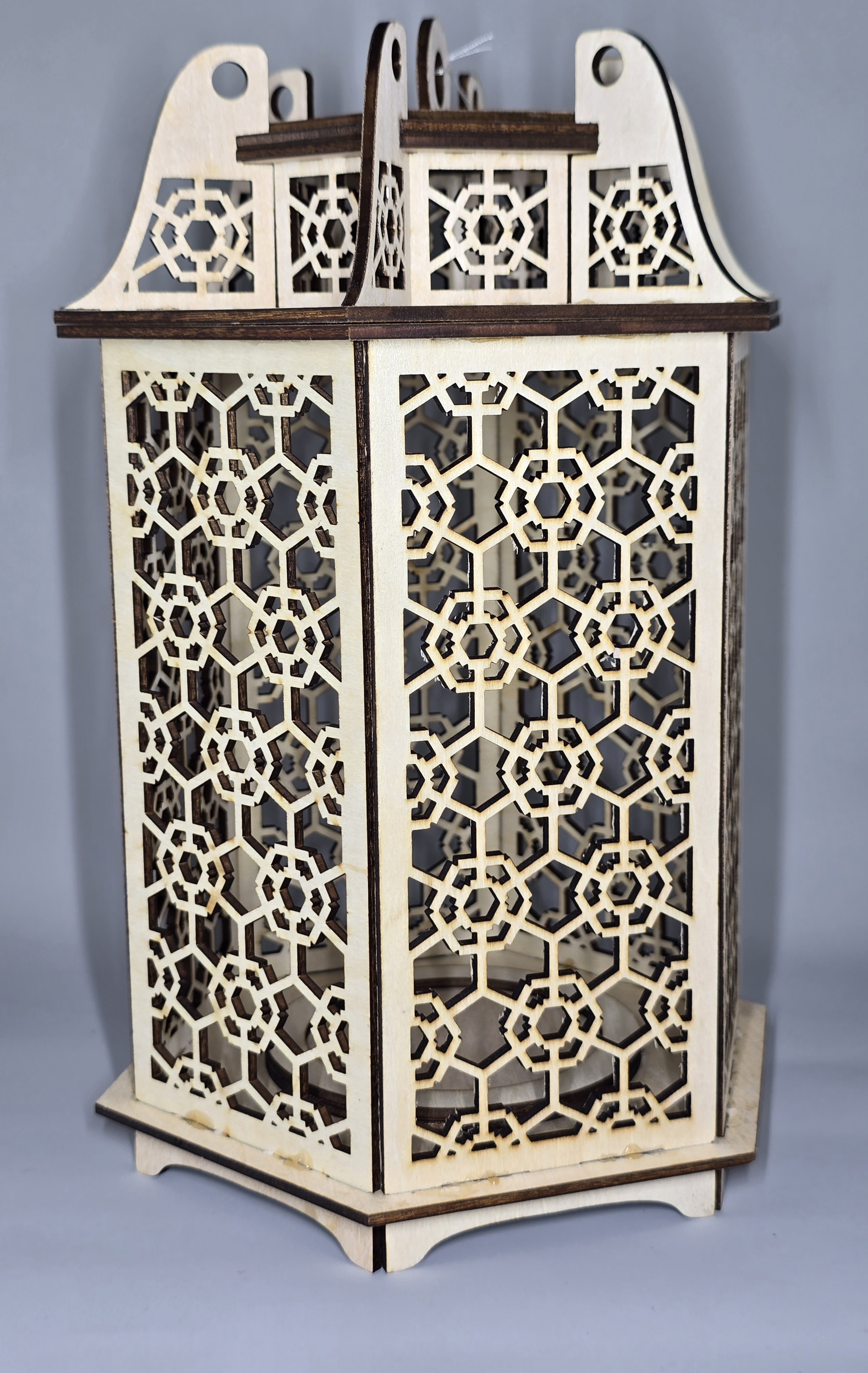 This lantern was laser-cut from basswood, and each piece was fitted together to create this sturdy wooden lantern. This hexagonal lantern stands approximately 10.5 inches tall and almost 6 inches in width. Each of the six panels incorporates a floral pattern in the traditional Kumiko style. When illuminated from inside, the panels cast stunning shadows.