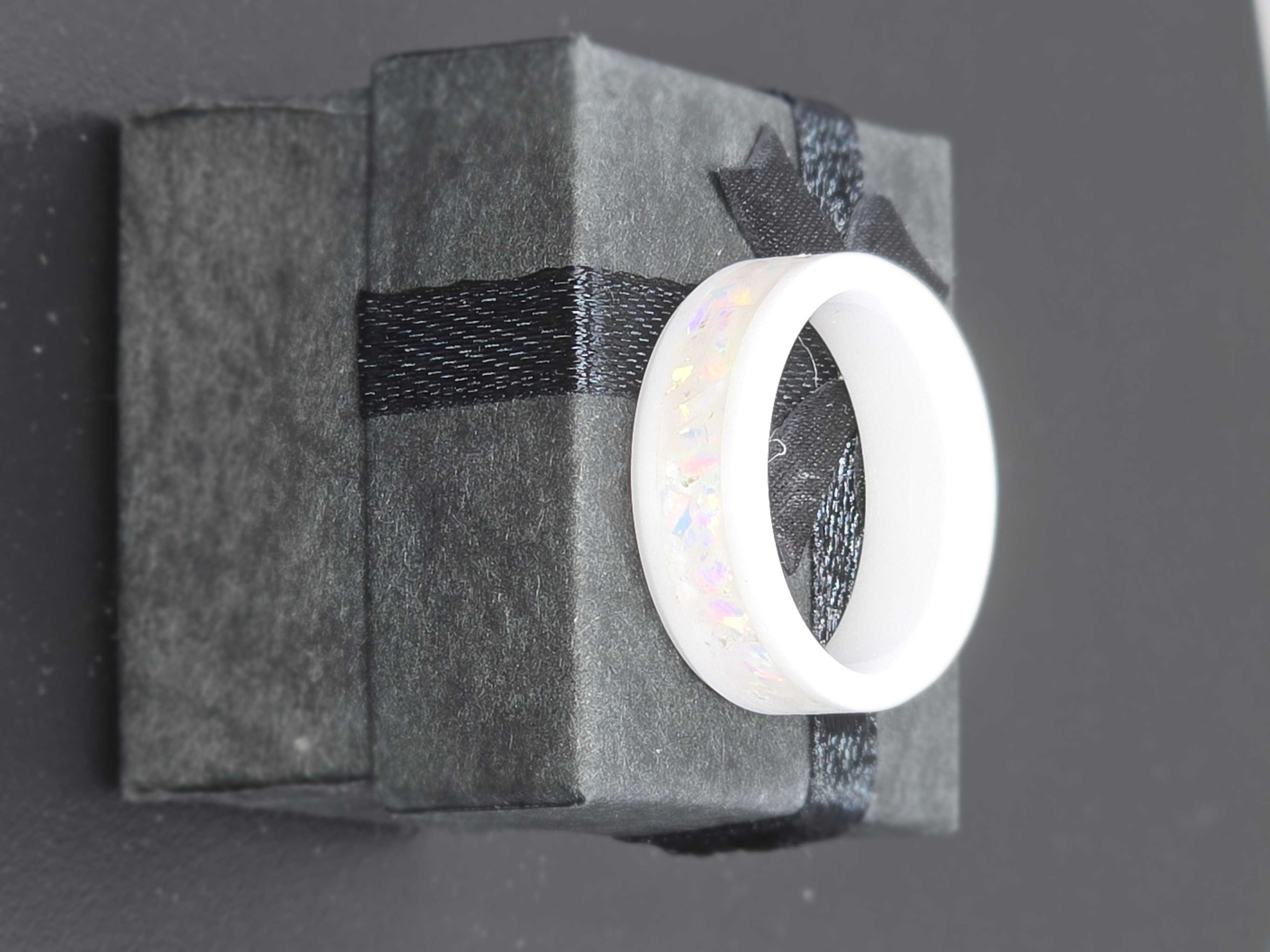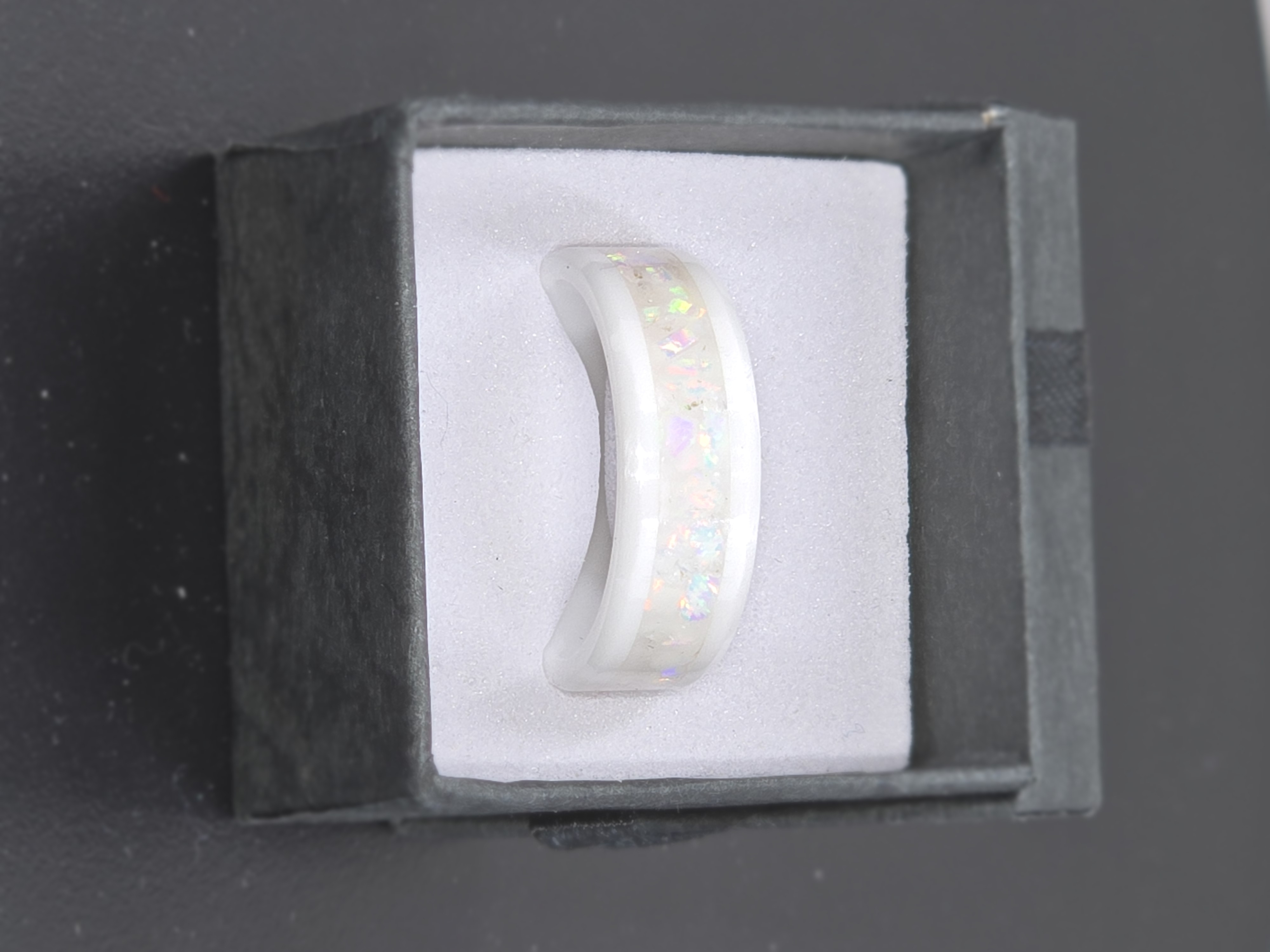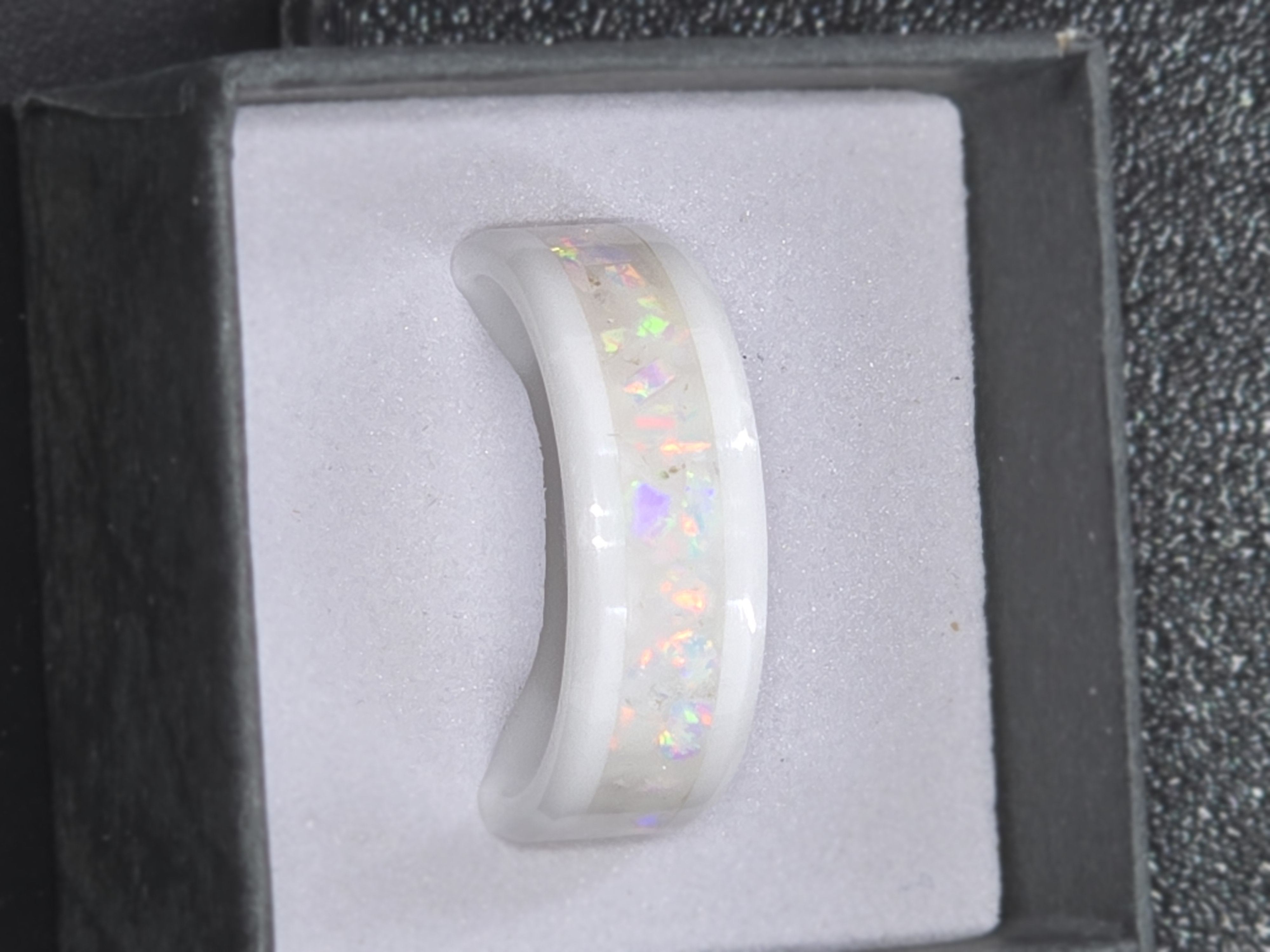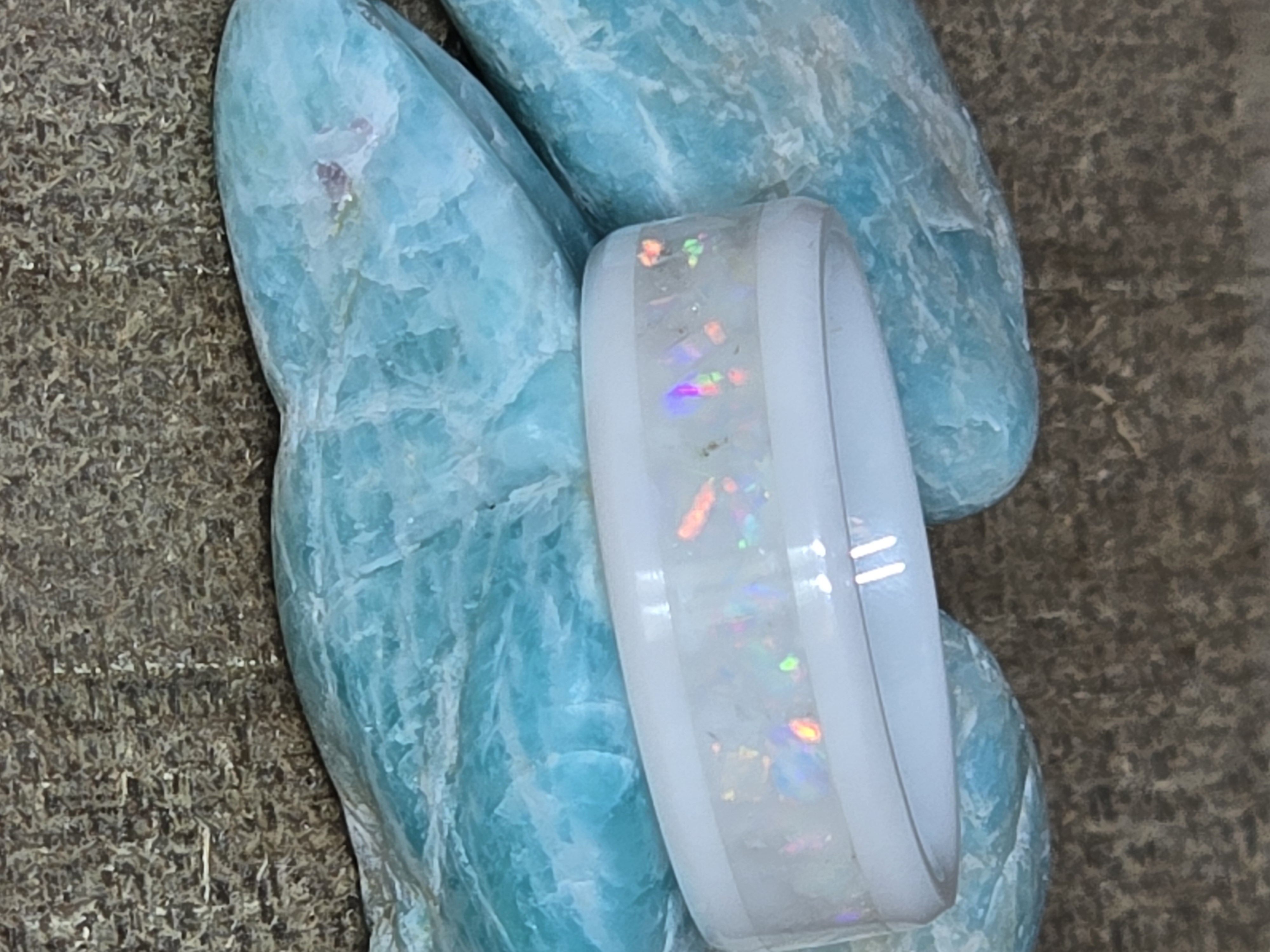 Your ring will is made with from an 8mm ceramic blank. The synthetic opal is carefully placed and encased in a durable material.