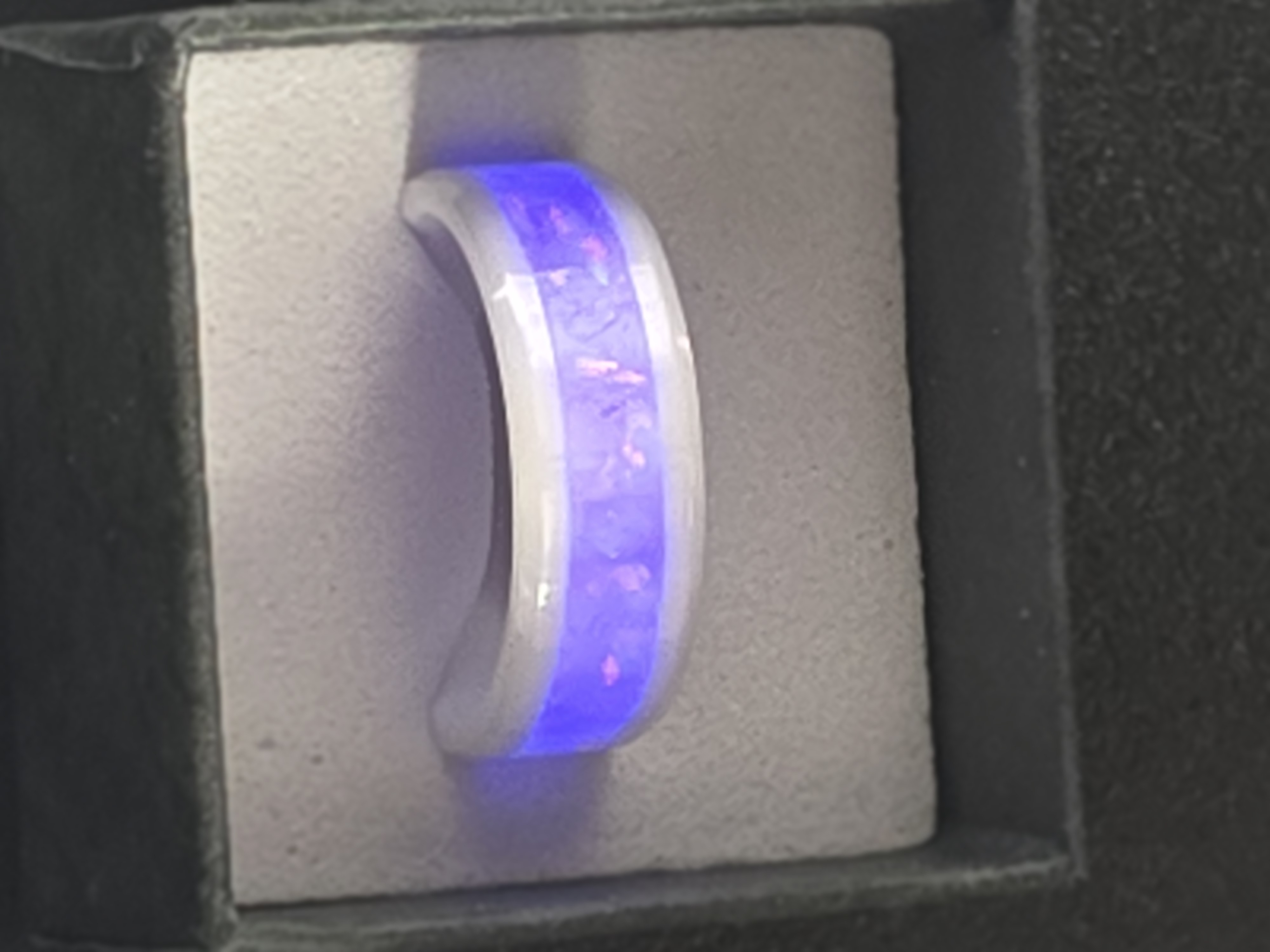 Who doesn't like a gentle snowfall? This ring captures the feeling and look of that first snowfall, where the snow flakes are light and fluffy. The ring captures the glisten of the fallen snow with the arctic opal, having hints of blue, green, yellow and red. At night, after being out and about all day, the ring glows with a gentle purple hue that depending on how long it is exposed to light, can last for many hours. You may also use a UV light to charge the glow powder to show your friends.